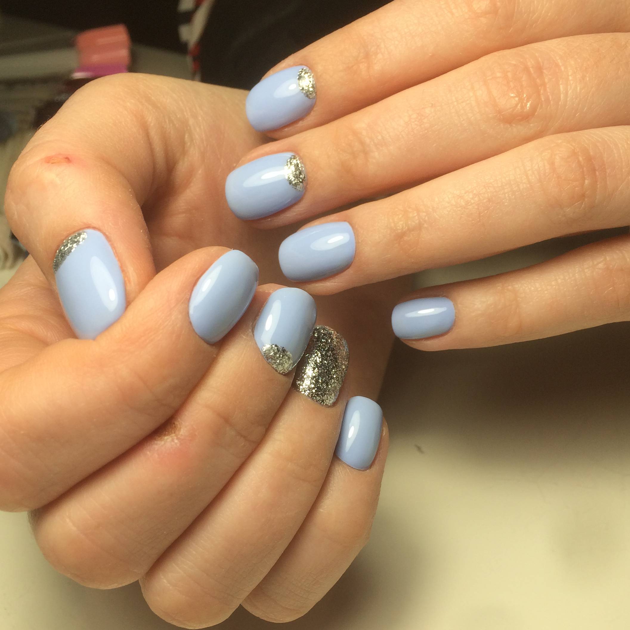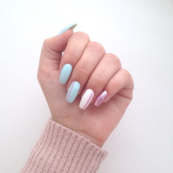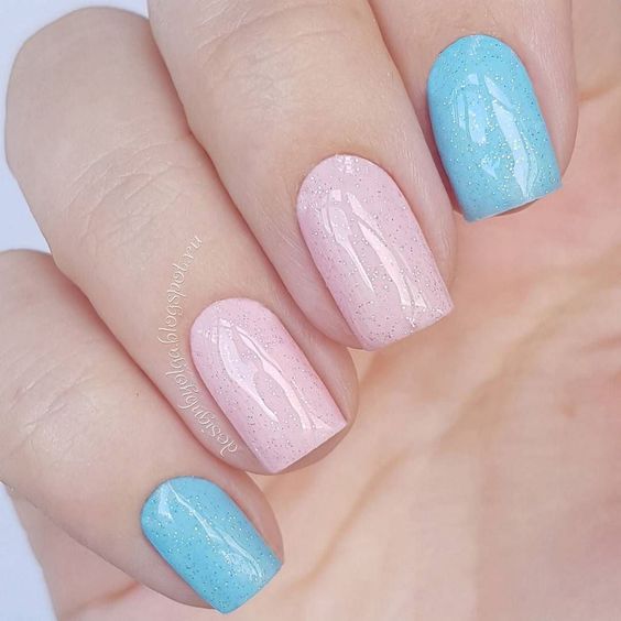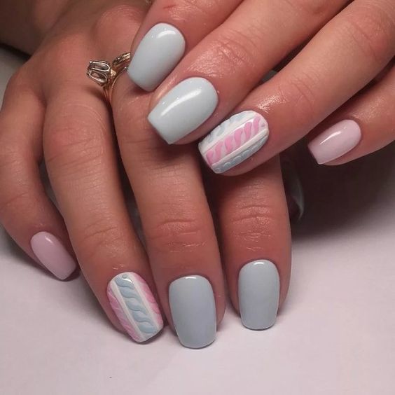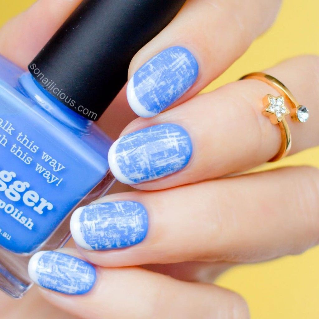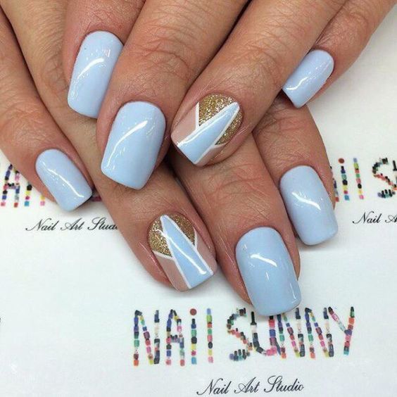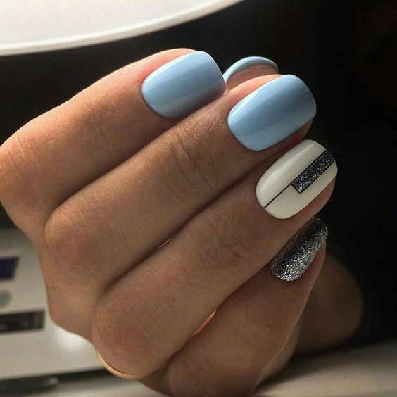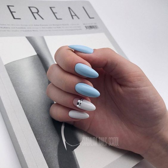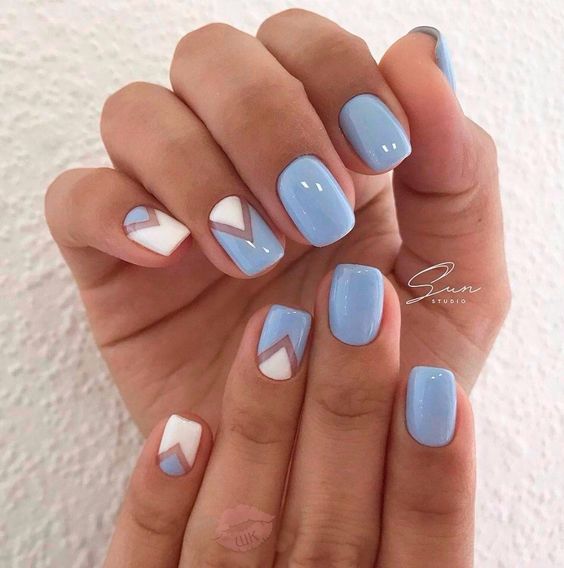 Незважаючи на велику популярність класичного дизайну, деколи хочеться внести різноманітність і доповнити цікавими деталями. В такому випадку можна просто поміняти відтінок на блакитний. За рахунок цього він буде виглядати зовсім по-іншому. До того ж, такий манікюр додасть вашому образу нотку ніжності і жіночності. До речі, незважаючи на нестандартне виконання, цей дизайн підходить навіть для роботи в офісі.