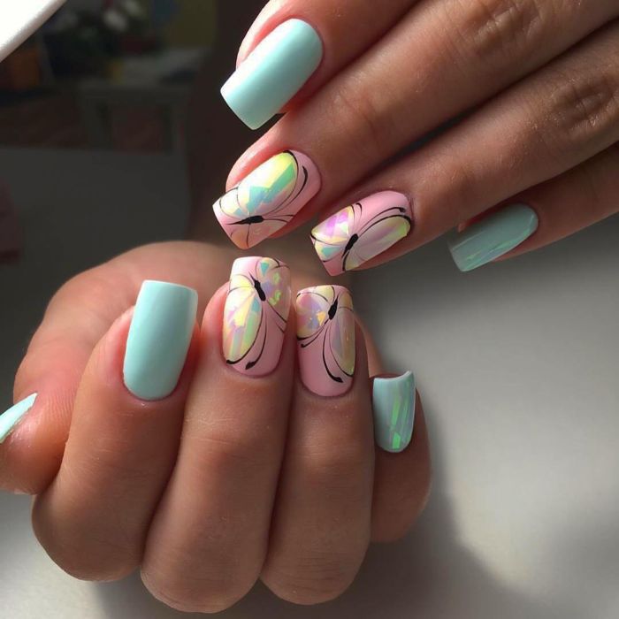 Так само актуальними залишаються і більш легкі, весняно-літні мотиви. Ніжні квіткові малюнки подобаються багатьом дівчатам. Це не дивно, адже такий манікюр стане відмінним прикрасою вашого образу. Не менш привабливо виглядає малюнок у вигляді метеликів. Дизайн в такому стилі – справжнє втілення легкості і жіночності.