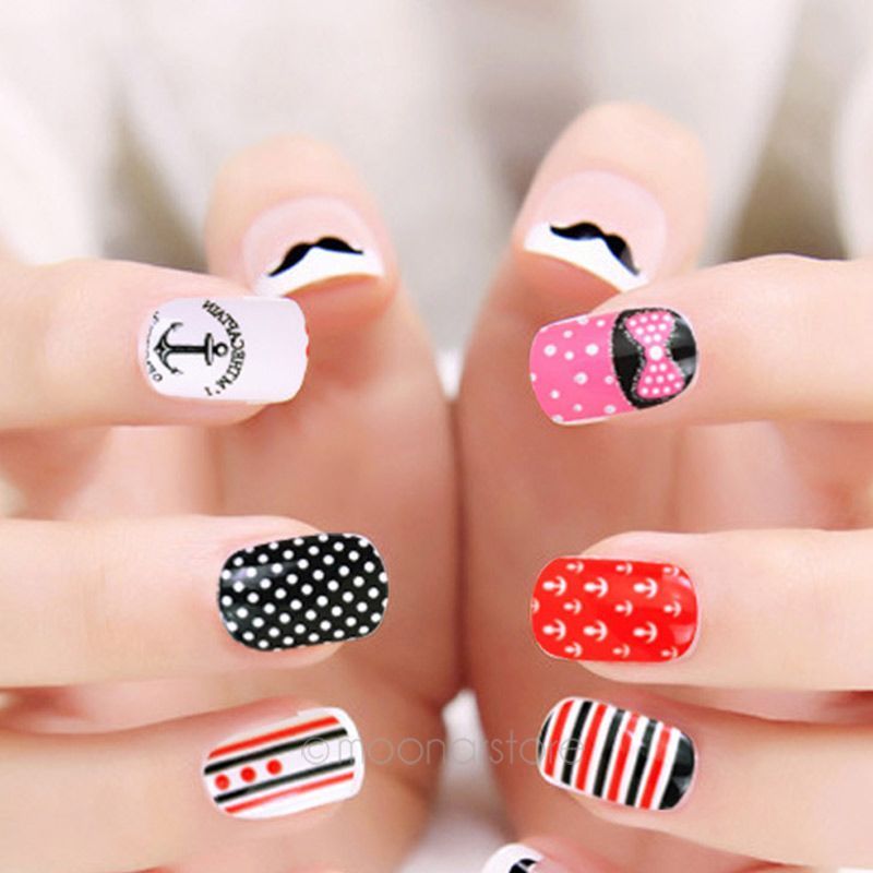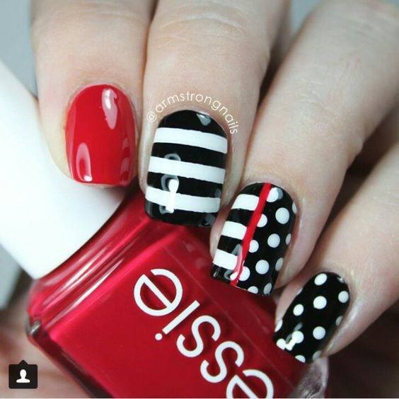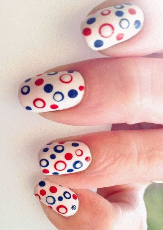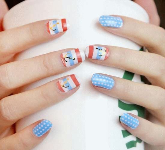 Гарний манікюр в горошок може наноситися не на всю пластинку, а частково, промальовуючи крапочки на матовому, однотонному або дзеркальному тлі. Розташування горошинок може бути хаотичним, так і суворим, чітким. Якщо ви в захваті від морського стилю, тоді манікюр з смужками і крапочками виконаний в білому і червоно-синьому поєднаннях – це, безсумнівно, ваш варіант. Цей манікюр можна доповнити аксесуарами у вигляді золотистих якорів, черепашок, зірочок.