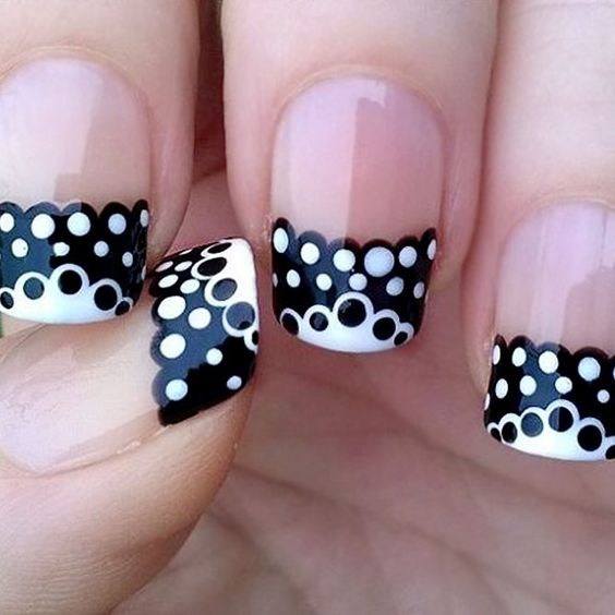 Чарівний манікюр з горошком, безсумнівно, не міг не поєднуватися з улюбленою технікою нанесення лаку у французькому стилі. Френч може бути намальований на всіх нігтики або прикрашати всього кілька нігтів, і на ньому чудово розташується горошок, тим самим послужить прикрасою френча. Прикраса на нігтях лунками стало назад популярним. Модні салони краси пропонують відвідувачам свіжі ідеї для місячного манікюру, одним з таких варіантів став малюнок в горошок в місячному дизайні. Горошком декоруються лунки або контрастують з однотонною лункою, якій прикрашаються кілька або всі нігтики. Для прекрасних дам, у яких середні або довгі нігті, підійде варіація з усмішечками або обгорнутими лунками, використовуючи контрастний тон, або такий же, як і горошинки. На питання, що може бути незвичніше і креативніше поєднань різнобарвного градієнта і горошку, відповісти досить просто — це тенденція нейл-арту 2018, представлена різновидом омбре з точками.