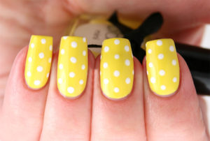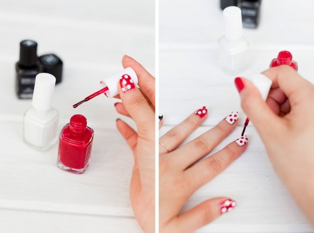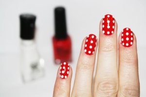 Наступний етап – фарбування лаком. Спочатку потрібно рівномірно розподілити основний тон, потім при необхідності нанести другий шар і дати йому добре висохнути. Тепер прийшов час малювати горошинки.