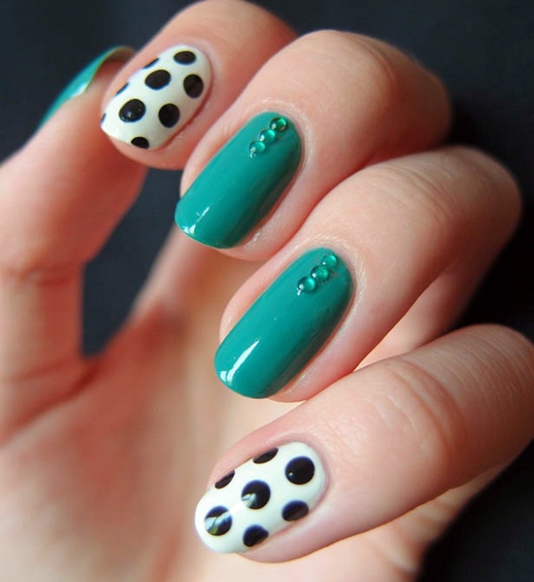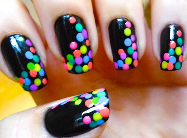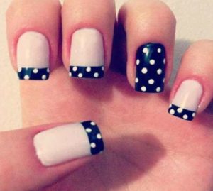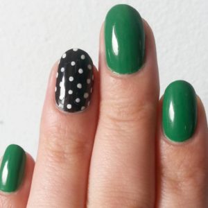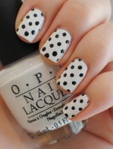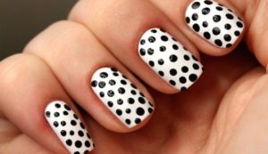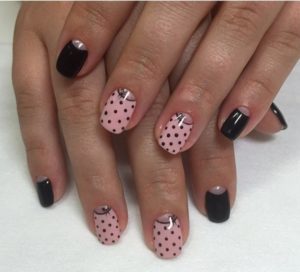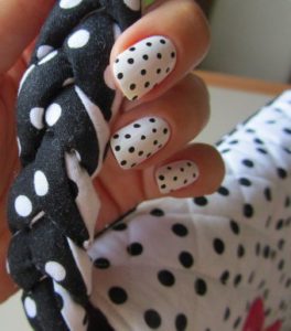 Одним з найбільш простих, неймовірно популярних і ефектних дизайнів в горох залишається класичне поєднання чорного і білого. Дуже виграшно виглядає комбінація ніжно-рожевого і блакитного – дані відтінки чудово підійдуть для романтичного побачення. Кольорові горошинки на чорному тлі – відмінний вибір для вечірки, особливо добре такий манікюр поєднується з маленьким чорним платтям.