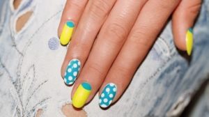 Цікавий дизайн з грайливими кружечками і гармонійне поєднання кольорів на нігтях помірної довжини – хороший вибір для сміливих дівчат.