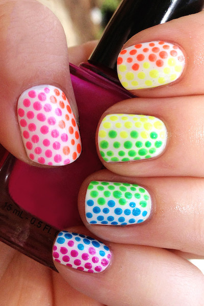 Червоні нігті в горошок або завзятий райдужний принт допоможуть виділитися з натовпу і піднімуть настрій в похмурі сірі будні. Досить яскраво і позитивно виглядають лише кілька кольорових крапель, нанесених на білу основу. Ще незвичніше виглядають однакові за розміром точки, пофарбовані в різні відтінки одного кольору – і темні, і світлі, при цьому переходи можуть бути досить хаотичними.