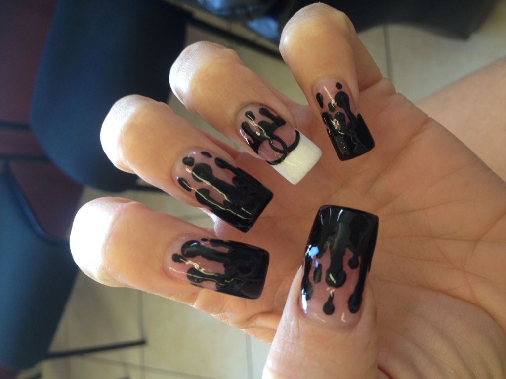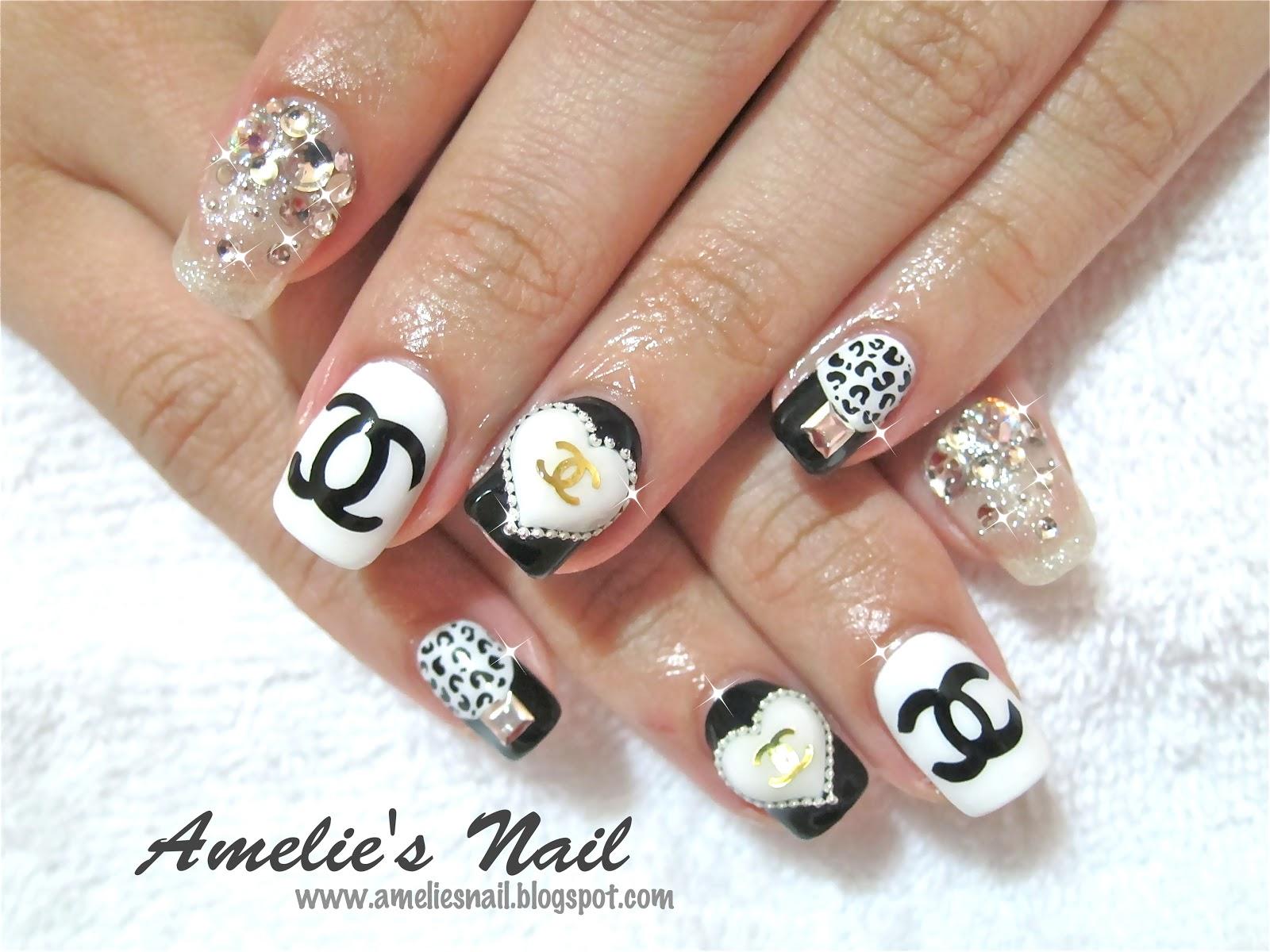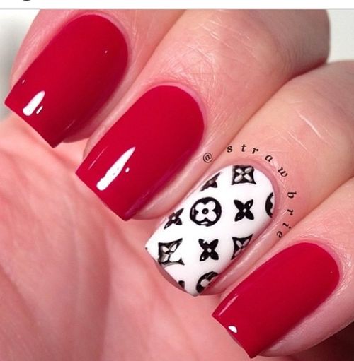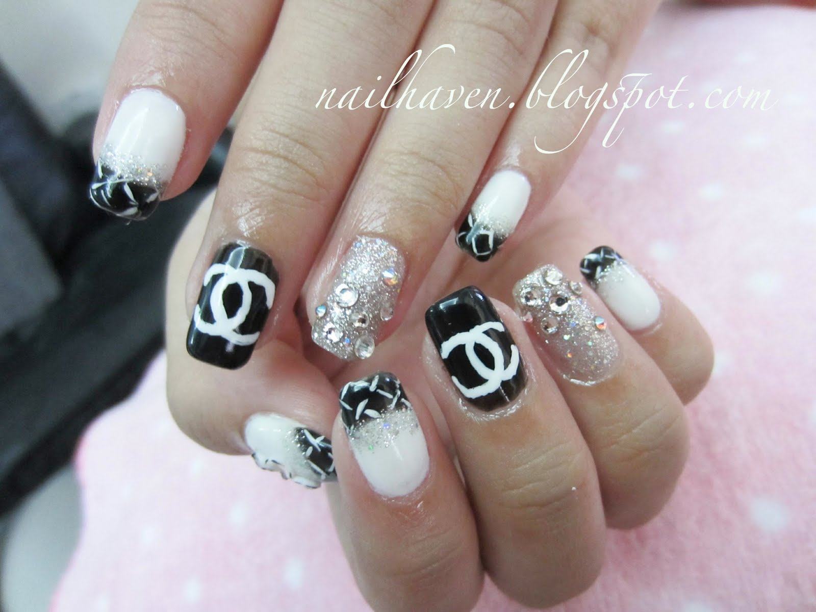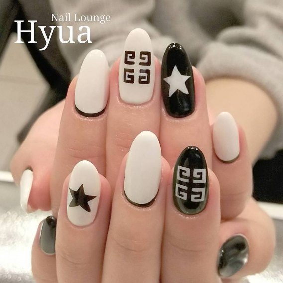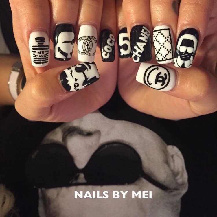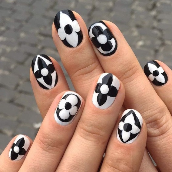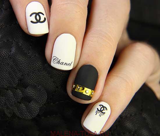 Найпоширеніший манікюр з логотипом виконується в чорно-білому варіанті. Класичний дует на нігтях можна з упевненістю назвати самим цікавим. Деякі майстри манікюру і стилісти вважають чорно-білий манікюр з логотипами дуже стриманим, хоча суворий контраст виглядає вишукано і неперевершено. В таких незвичайних варіаціях не зовсім доречні стрази, так як більшість відомих фірм не прикрашають фірмову символіку елементами декору. Логотип вже сам по собі є основою манікюру.