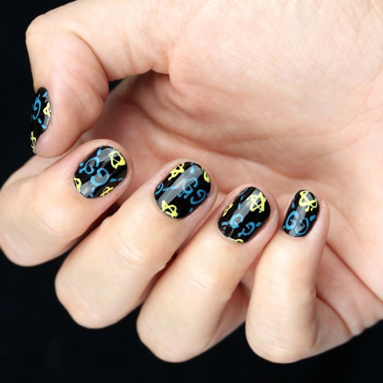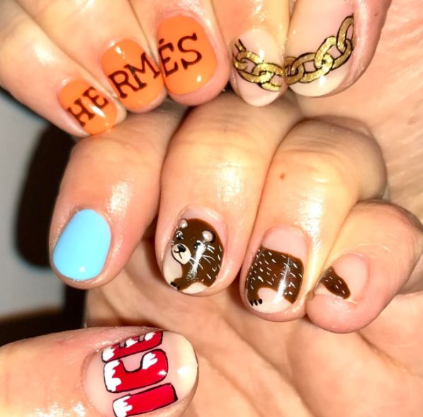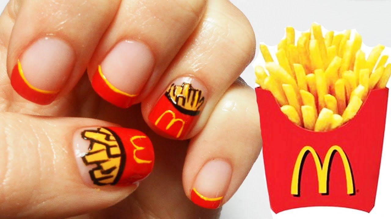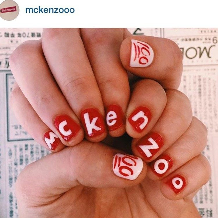 Логотип і ще раз логотип… і нічого більше. Благородний манікюр з брендовим знаком в 2018 році характеризується як благородний. Нанесення логотипу не обмежується жодними правилами. Його можна нанести на один з пальців, а можна — на кожному. Одним з найцікавіших варіантів з нотками гумору є манікюр з логотипом Макдональдса.