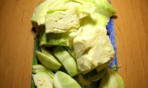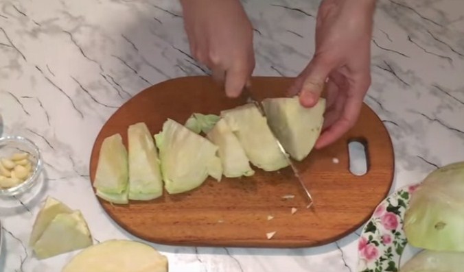 2. Потім приступаємо до підготовки овочів. Качан капусти розрізаємо на невеликі шматочки, якщо маленький вилок, то можна і зовсім розрізати на 5-6 частин. За бажанням можна листочки відразу розшарувати.