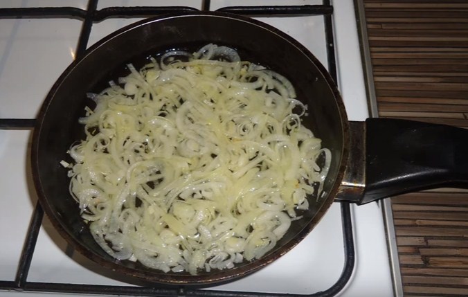 6. Нарізаємо півкільцями цибулю і відправляємо в добре розігріту сковороду з рослинним маслом. Цибулю у нас нудитися до прозорості.