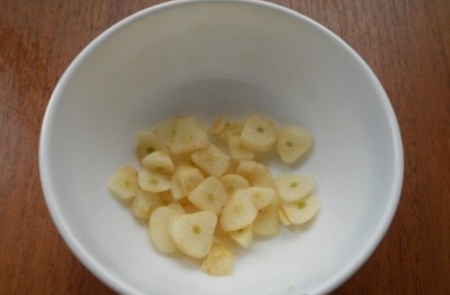 4. Часник чистимо від лушпиння, і ріжемо на тонкі пластинки.