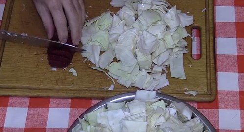 2. Капусту ріжемо на 2 частини, вирізаємо по центру качан, потім ріжемо на кубики. Буряк ріжемо на пластинки.