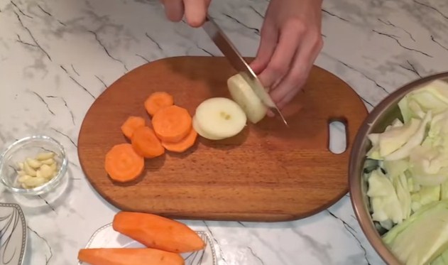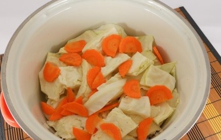1. Беремо качан капусти і нарізаємо на брусочки (квадратики). Якщо у вас маленькі качанчики, ще краще — розрізаємо їх на 6-8 частин. Перекладаємо в каструлю. Нарізаємо тонкими кільцями моркву (якщо велика ріжемо півкільцями) і викладаємо поверх капусти.