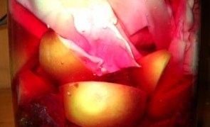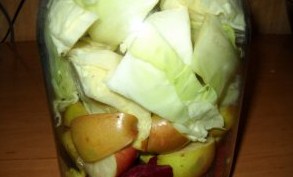 5. На дно чистої 3-х літрової банки кладемо лавровий лист, часник, перець горошком. Потім укладаємо буряк. На буряки кладемо шматочки яблук.