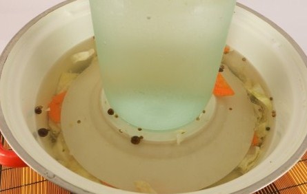 8. Тепер зверху овочів кладемо тарілку, гарненько притискаючи (утрамбовуючи), щоб піднявся маринад.