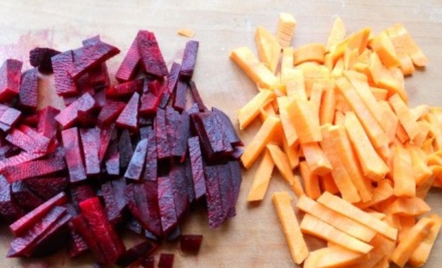 3. Потім моркву і буряк очищаємо від шкірки і нарізаємо крупною соломкою. Знову ж, за бажанням можна нарізати тонкими кружечками або брусочками.