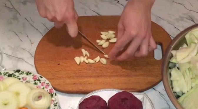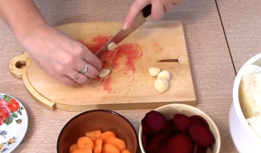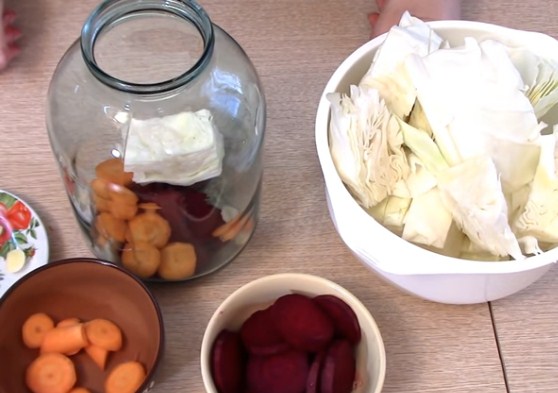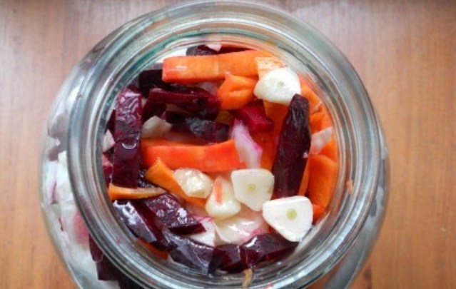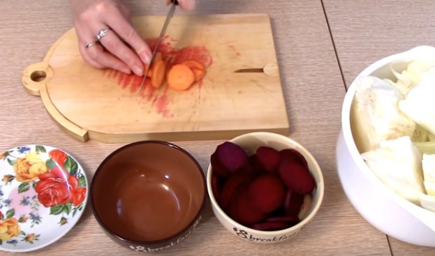 4. Коли всі овочі нарізані, нам потрібно їх щільно скласти в банку шарами. Першим шаром у нас буде буряк, другим морква, слідом часник і найбільший шар — капуста. Потім знову на купустку кладемо буряк і по колу. Всього я втрамбовую овочі в два кола.