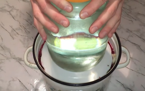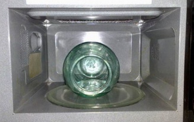 1. Маринувати ми будемо в 3-х літровому бутлі, тому нам потрібно відразу його простерилізувати. Я буду це робити в мікрохвильовці, так як не дуже хочеться з-за однієї банки напускати в кухню пар або включати духовку. Наливаю в скляну тару трошки води і відправляю в СВЧ піч боком (стоячи банку не влізе) на найвищу потужність на 4-5 хвилин.