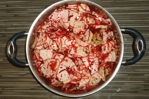 Я і зараз, як тільки настають холоди запасаюся білокачанної, але звичайно не в таких масштабах, а по скромному. І звичайно ж, рецепт «Пелюстки» з буряком (а у нас її називають з буряком) — один з моїх найулюбленіших. Маринується капуста разом з буряком, що і надає її листочків такий неповторний рожевий колір. Саме із-за кольору, який дуже схожий на пелюстки троянд і отримала ця пікантна лакомка свою назву, адже з української мови «пелюстка» перекладається як «пелюстка». А смак цього салату залежить від маринаду, яким були залиті овочі.