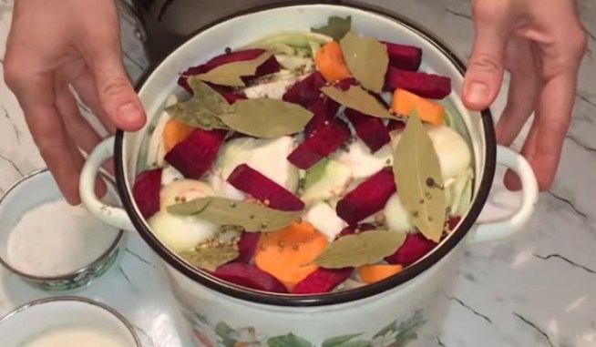 5. Отже, у нас всі підготовлені овочі, тепер нам потрібно взяти велику ємність. У моєму випадку це емальована каструля, так як інгредієнтів багато і вони не вмістяться в бутель. Візуально ділимо овочі на три рівні частини і починаємо закладати шарами. Першим шаром викладаємо капусту, потім цибулю, далі морква, часник і останній шар — буряк.