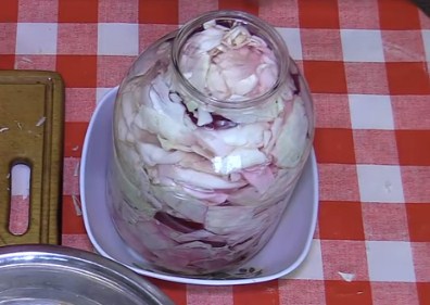 Ще один шалено смачний рецепт рожевої закуски, але без додавання оцту! Звичайно, такі пелюстки будуть готуватися не багато довше ніж з оцтом, але це того варто! Маринувати будемо в 3-х літровій банці. Але це не обов’язково, ви можете взяти тару і побільше. Головне, щоб розсіл покривав овочі.