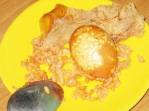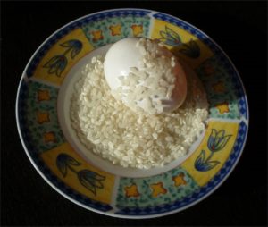 Яйця також заздалегідь дістають з холодильника. Висипають в миску рис (від його форми буде залежати майбутній мармуровий малюнок). Яйця змочують у теплій воді і обвалюють у рисі (бажано, щоб він рівномірно покрив всю поверхню шкаралупи).