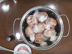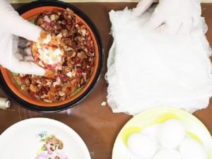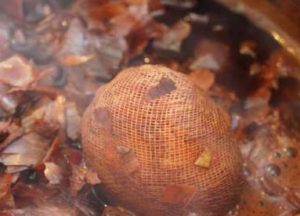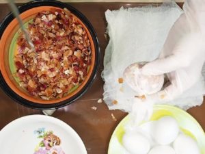 Закутують у квадратний шматочок марлі і щільно пов’язують кінці, щоб рис не зміщувався. У каструлю викладають лушпиння цибулі, заливають водою, солять її і опускають загорнуті з рисом яйця. Каструлю ставлять на плиту і доводять до кипіння, зменшують вогонь і варять близько 10-15 хвилин.