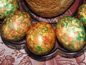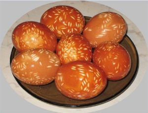 Мармурове фарбування яєць на Великдень можна також отримати і з іншим малюнком, якщо використовувати для цього рис. В даному випадку варити яйця також необхідно буде в цибулинні, але тільки загорнуті не з нею, а з рисом.