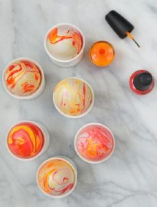 Як не дивно, але не тільки з застосуванням натуральних барвників можна створити мармуровий малюнок. Мармурову фарбування яєць на Великдень можна виконати навіть з використанням лаку для нігтів.