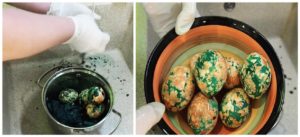 Після варіння каструлю ставлять в раковину, включають воду і чекають, поки проточна вода, наповнить каструлю і, стікаючи, не посвітлішає. Після цього можна вимкнути воду і злити залишки рідини. Це слід робити виключно в рукавичках. Після яйця розгортають і очищають від лушпиння, промивають і викладають на тарілку обсохнути.