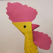 - Голова: дзьобик виготовлений з 1 М червоного кольору. З паперу червоного кольору також потрібно вирізати фігурними ножицями шаблон у формі серця: 1 — для борідки і 2 — для гребінця. Сама голова — це 1 М жовтого кольору, але більшого розміру (7,4 х 10,5 см), вирізаний із паперу розміром А4/8;