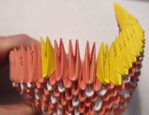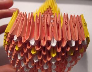 - Основа курочки: зібрати 7 рядів по 40 М. 1-й р. – жовті модулі, 2-й р. — чергуються 1 білий, 1 жовтий М. Далі продовжують чергування модулів до 7-го ряду;
