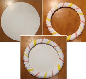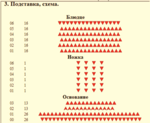 - Підставка для курочки виконується з 66 М: чергуються 2 помаранчевих, 1 білий. Для дна підставки потрібно вирізати з кольорового картону круг і приклеїти його;