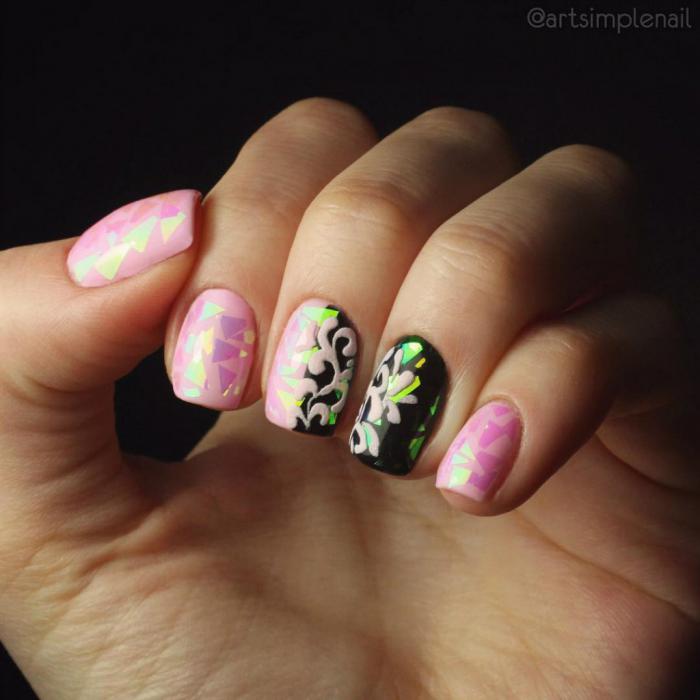 Найчастіше «бите скло» використовують для покриття на один або два нігтика. За рахунок цього воно має дзеркальний вигляд. Не менш привабливо виглядає декор у вигляді частинок цієї фольги різного розміру і форми. Таким чином нігтик буде мерехтіти, як тільки на нього потраплять сонячні промені.