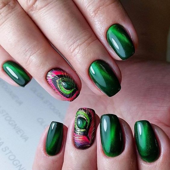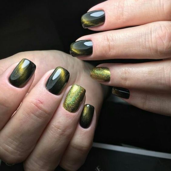Дизайн під назвою «котяче око» знайомий кожній модниці. Вся справа в тому, що він актуальний уже далеко не перший рік і все утримує лідируючі позиції. Найчастіше його вибирають для осінньо-зимового сезону, так як більшість представлених лаків мають темні, насичені, глибокі тони. Тому це ідеальний варіант для вечірнього виходу або святкування.
