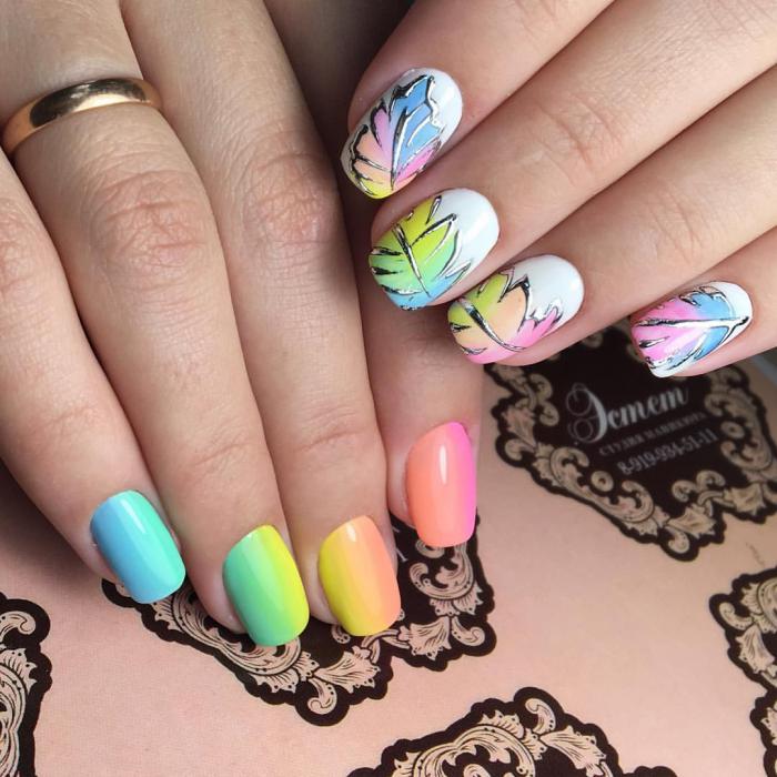 Все також залишається актуальним манікюр з ефектом омбре. З його допомогою можна домогтися абсолютно різного візуального ефекту на ваших нігтиках. Все залежить від обраних відтінків і їх кількості. Найбільш часто майстри використовують два-три кольори. Однак зовсім не обов’язково дотримуватися цього правила.