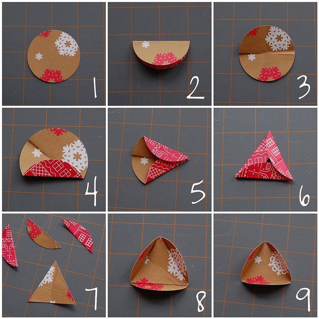 Одну з них будемо використовувати в якості шаблону. Для цього складаємо його навпіл і злегка зміщуємо в бік, як показано на фото. Формуємо трикутник і відрізаємо все зайві частини, залишаючи його в якості шаблону. Беремо заготовку, вкладаємо в неї трикутник і злегка загинаємо інші краї. По черзі повторюємо те ж саме з кожної.