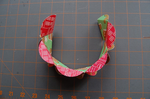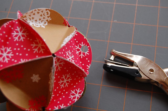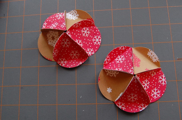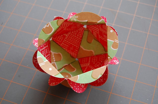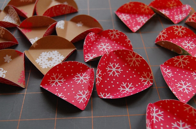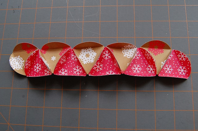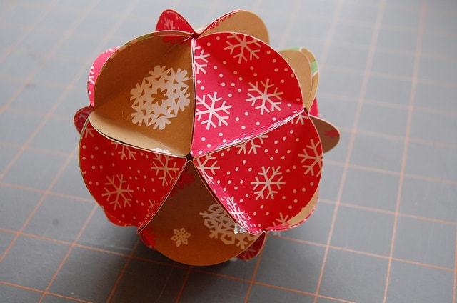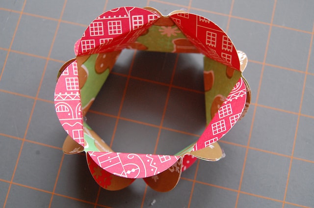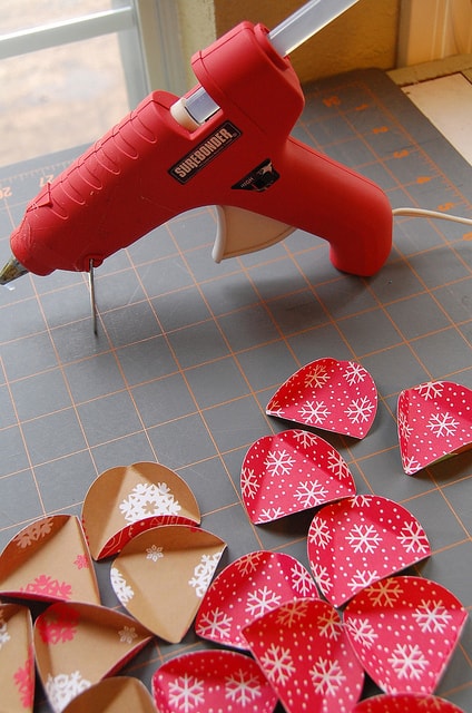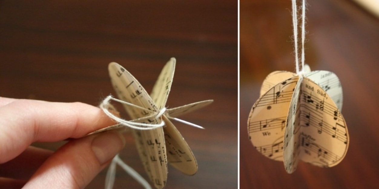 Згинаємо шість кіл навпіл і склеюємо між собою. До основи прив’язуємо щільну нитка або шпагат, щоб іграшку можна було повісити на ялинку.