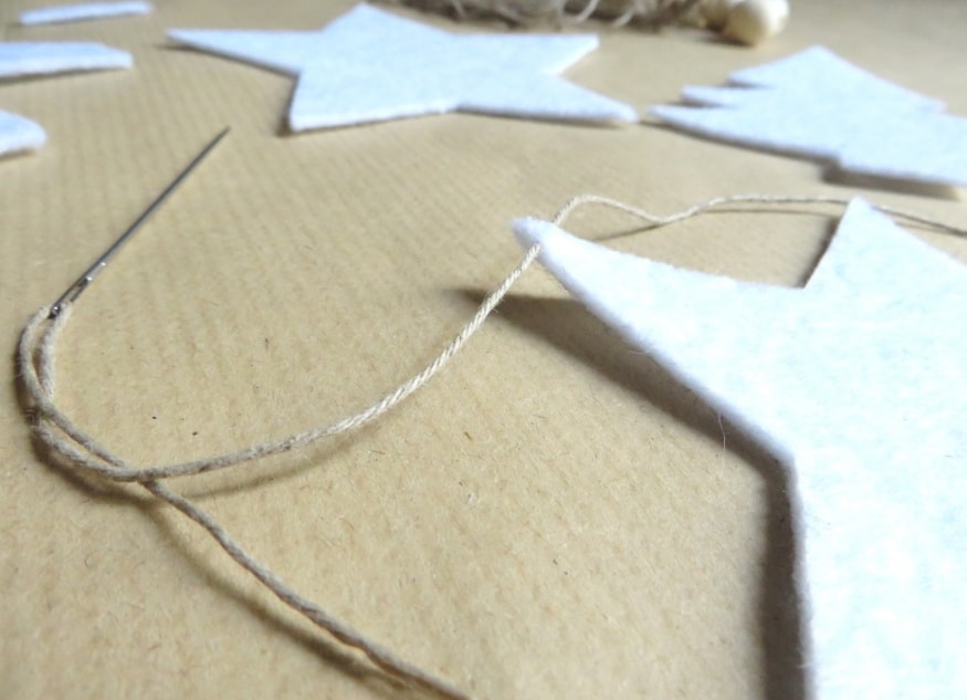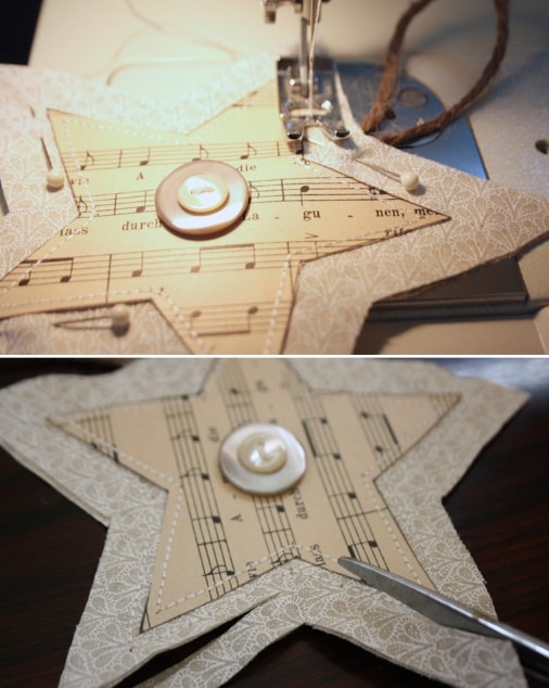 Пришиваємо до однієї з зірок гудзик. Після цього з’єднуємо їх так, щоб тканинні були всередині. Між ними вкладаємо мотузку, щоб сформувати петельку. Закріплюємо конструкцію шпильками і зшиваємо.