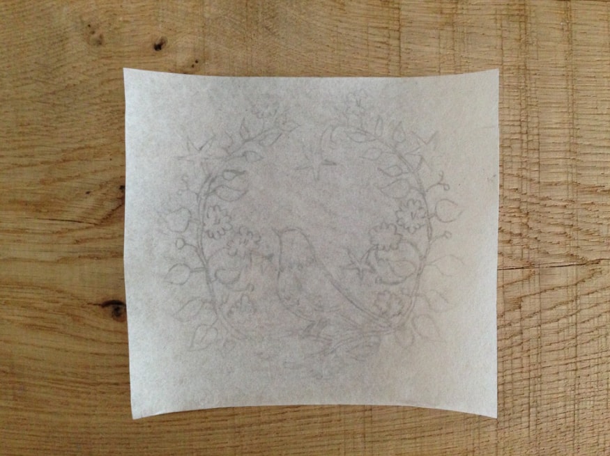На одній стороні кальки малюємо остаточний варіант ескізу. Перевертаємо його і закріплюємо на аркуші акварельному папері. Акуратно переносимо на неї малюнок.