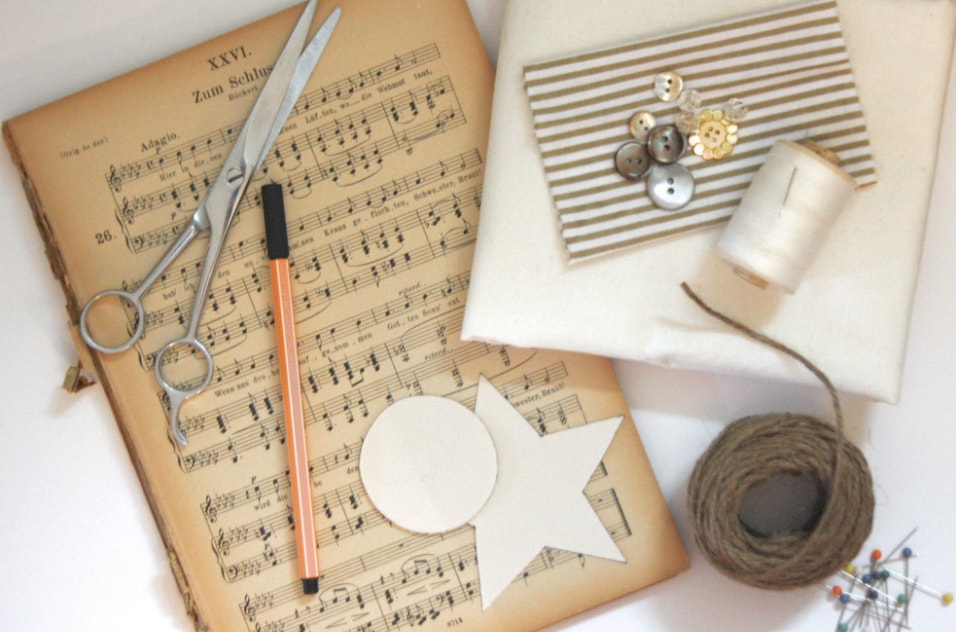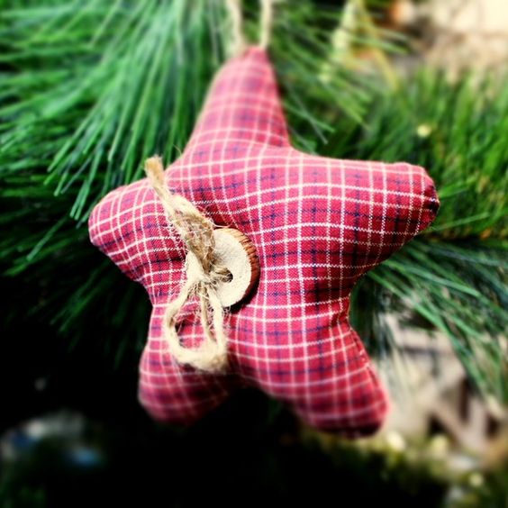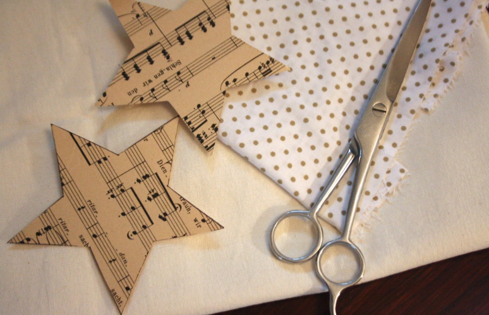 Прикладаємо до тканини трафарет і малюємо зірку, на сантиметр або півтора більше з кожної сторони. Акуратно вирізаємо заготовку. Враховуйте, що для однієї іграшки знадобиться дві заготовки з тканини і дві з паперу.