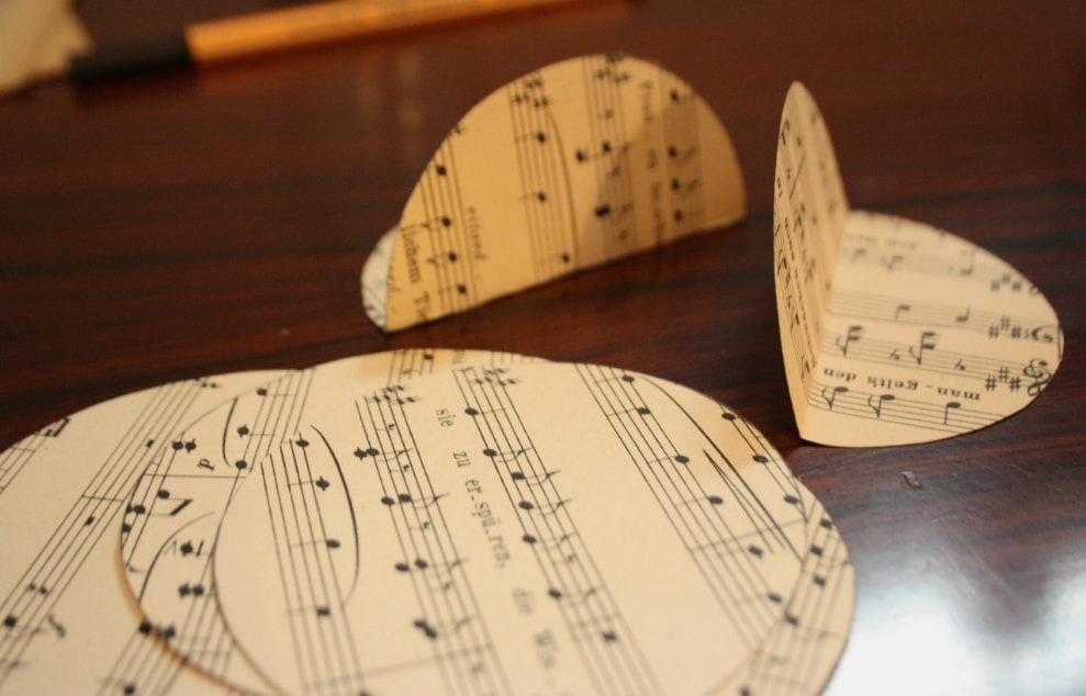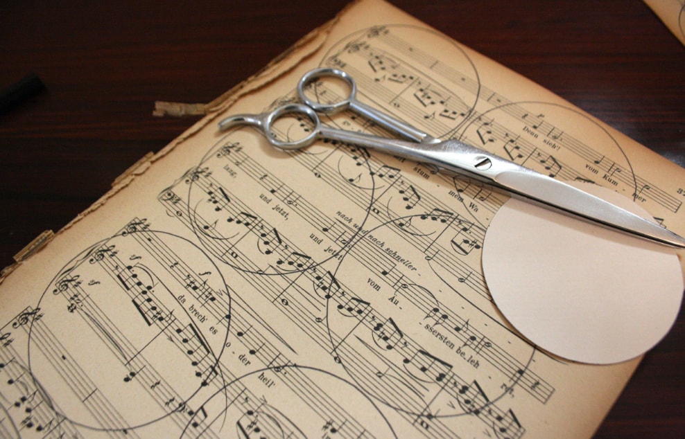 З картону робимо шаблон круглої форми і вирізаємо її. Розмір шаблону може бути будь-яким. Обводимо його на аркушах з нотами і вирізаємо.