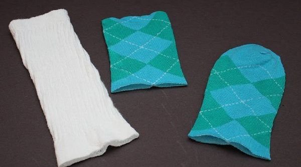 Для початку беремо світлий носок і відрізаємо від нього верхню частину. Від кольорового носка відрізаємо не тільки вгору, але і носочок.