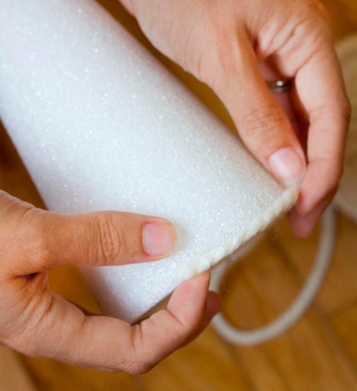 Білий відрізок зашиваємо з вивороту з нижнього краю. Наповнюємо його синтепоном або іншим наповнювачем і зшиваємо, як показано на фото.
