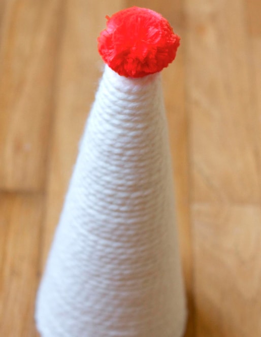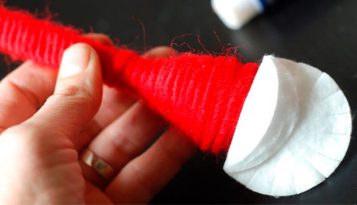 З ниток червоного кольору робимо помпон і приклеюємо його до вершини конуса. При бажанні можна придбати готові помпони різних відтінків.