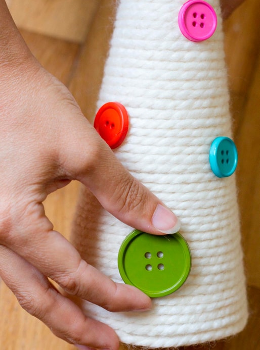 Яскраві гудзики приклеюємо у вільному порядку до заготівлі. Яскрава, стильна ялинка для декору готова!