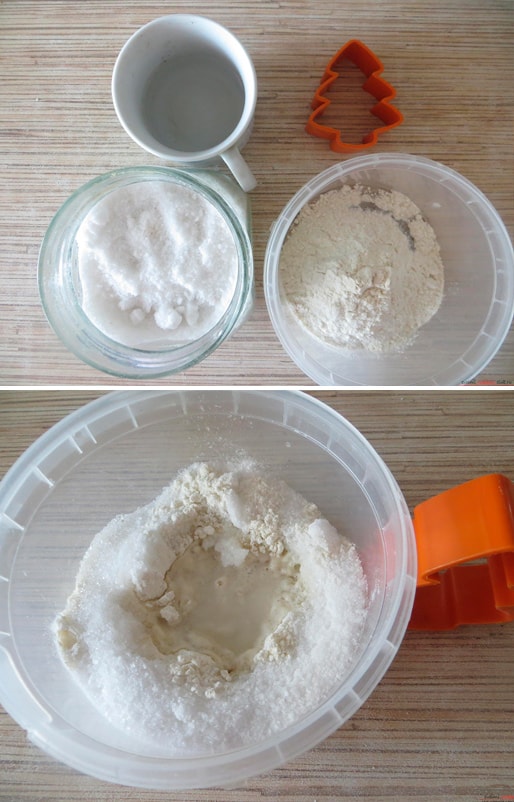 У невеликій ємності змішуємо три столові ложки борошна і шість ложок солі. Поступово додаємо воду, але не більше двох столових ложок. Замішуємо тісто, яке має бути досить м’яким.