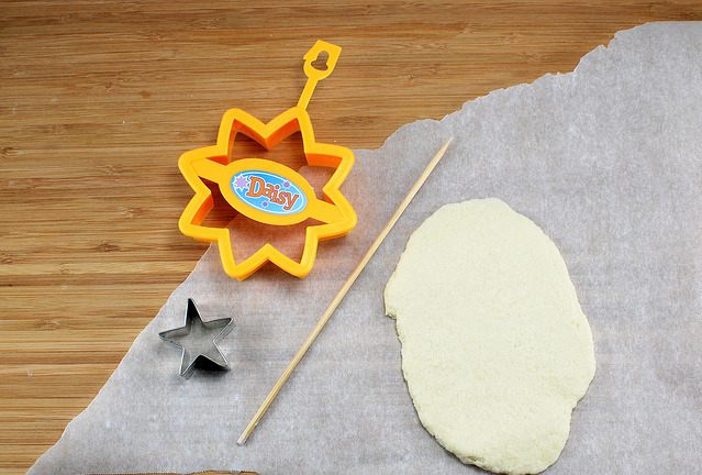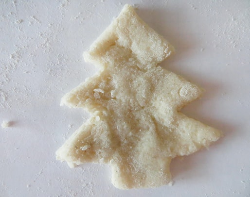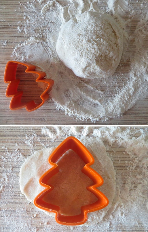 Присипаємо робочу поверхню борошном і розкачуємо тісто. За допомогою формочки видавлюємо необхідну кількість ялинок.