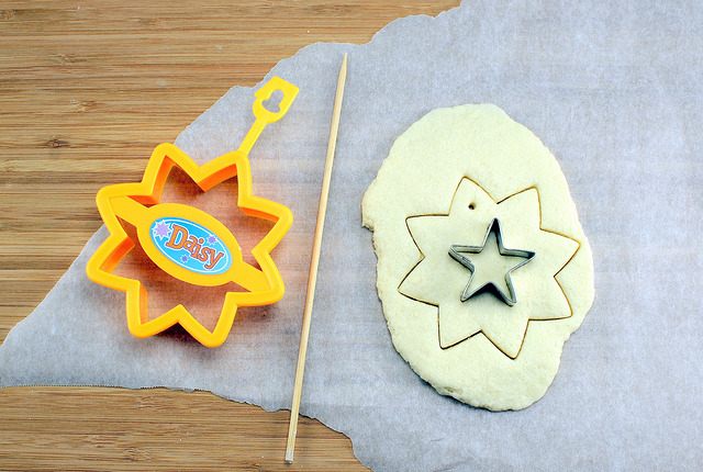 За допомогою формочки видавлюємо сніжинку. При бажанні можна використовувати форми різних розмірів, щоб створювати не схожі один на одного сніжинки. На цьому етапі робимо невеликий отвір, щоб виріб можна було повісити.
