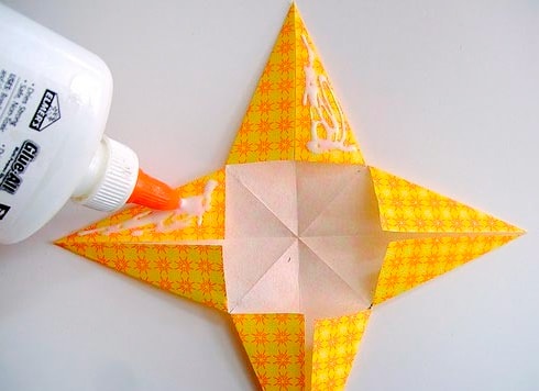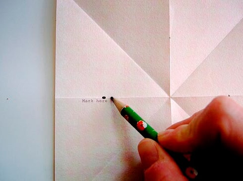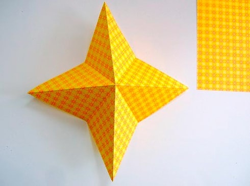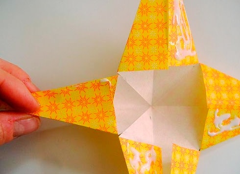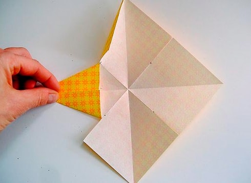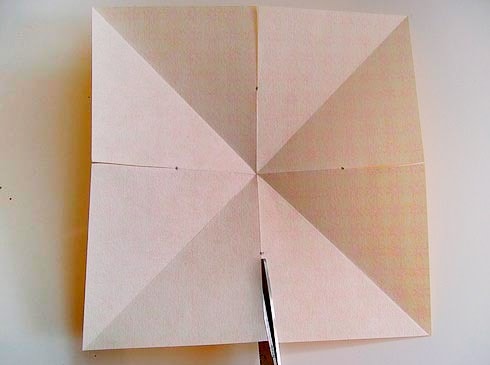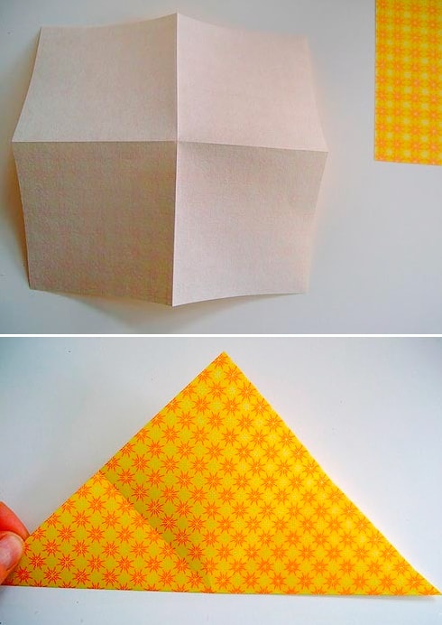 Складаємо один аркуш кольорового паперу на чотири частини. Розгортаємо і складаємо по діагоналі.