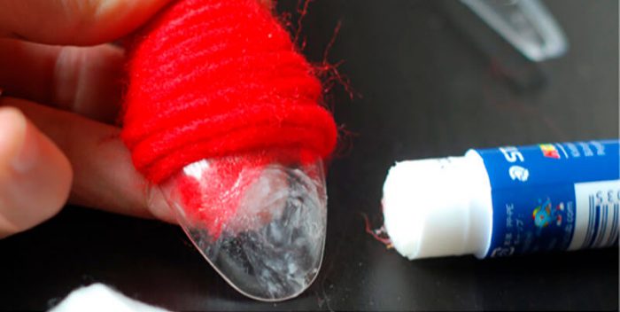 Наносимо клей з обох сторін ложки і до опуклої частини приклеюємо особа Діда Мороза.