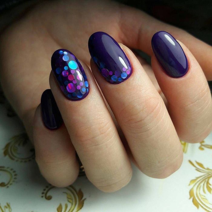 Блискітки вже давно використовуються для декорування манікюру. Це не дивно, але навіть невелика їх кількість перетворює однотонне покриття. Більш того, при бажанні можна використовувати трафарет у вигляді малюнка. З його допомогою вдасться зробити гарний, блискучий візерунок на ноготке. Але враховуйте, що дуже важливо підібрати правильний помел блискіток. Адже занадто великі можуть лягти нерівномірно, а дизайн буде виглядати безглуздо.